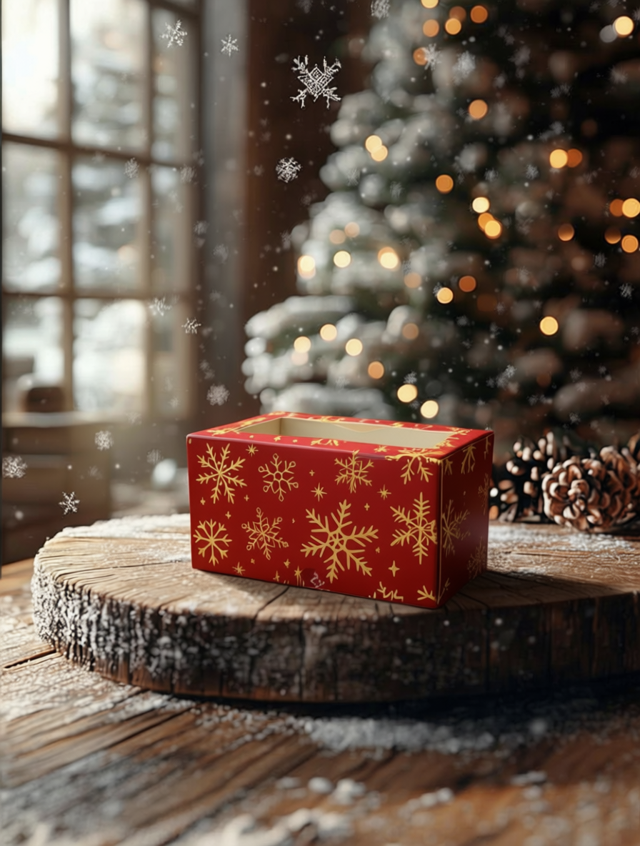 Коробка с окном под 2 капкейка Снежинки на красном, 160х100х80 мм