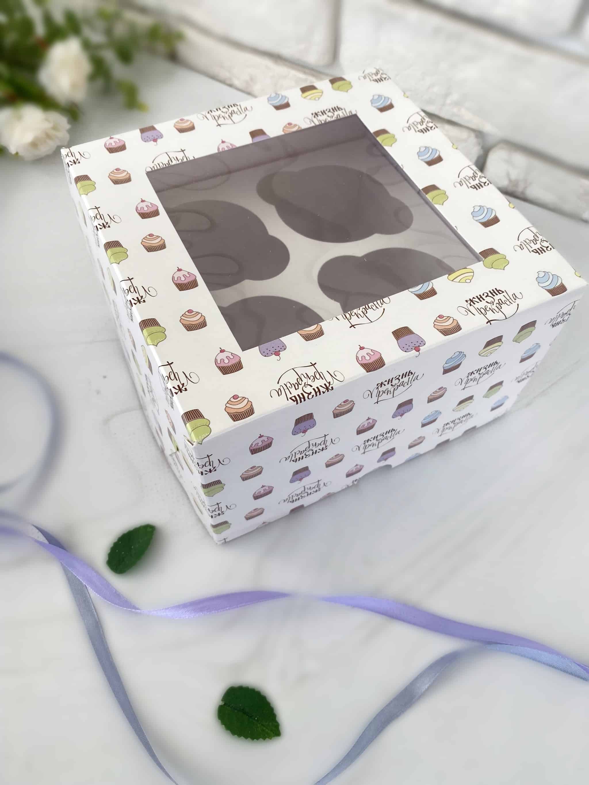 Упаковка под 4 капкейка/пирожных/бенто-торт с окном «Жизнь прекрасна»