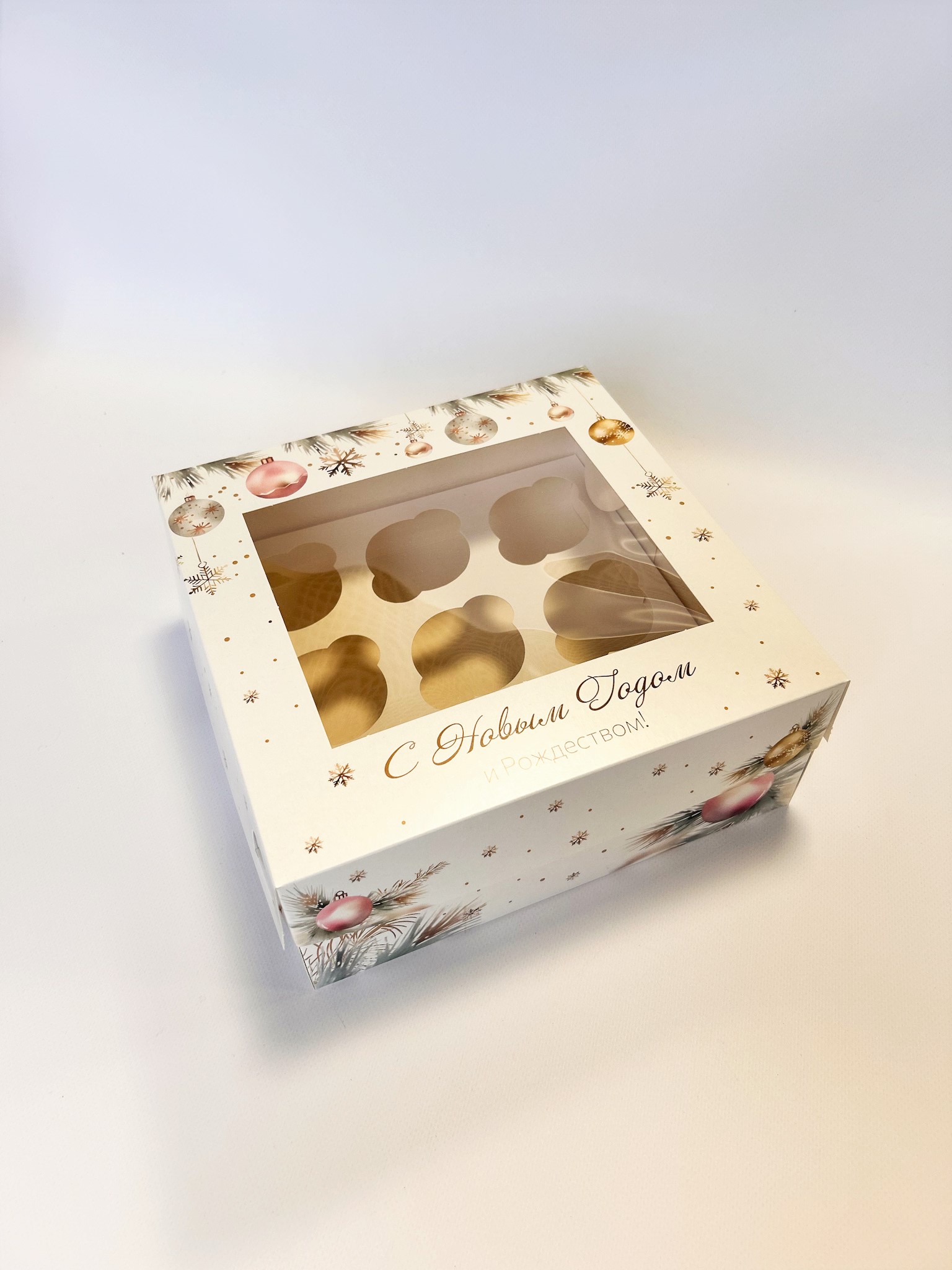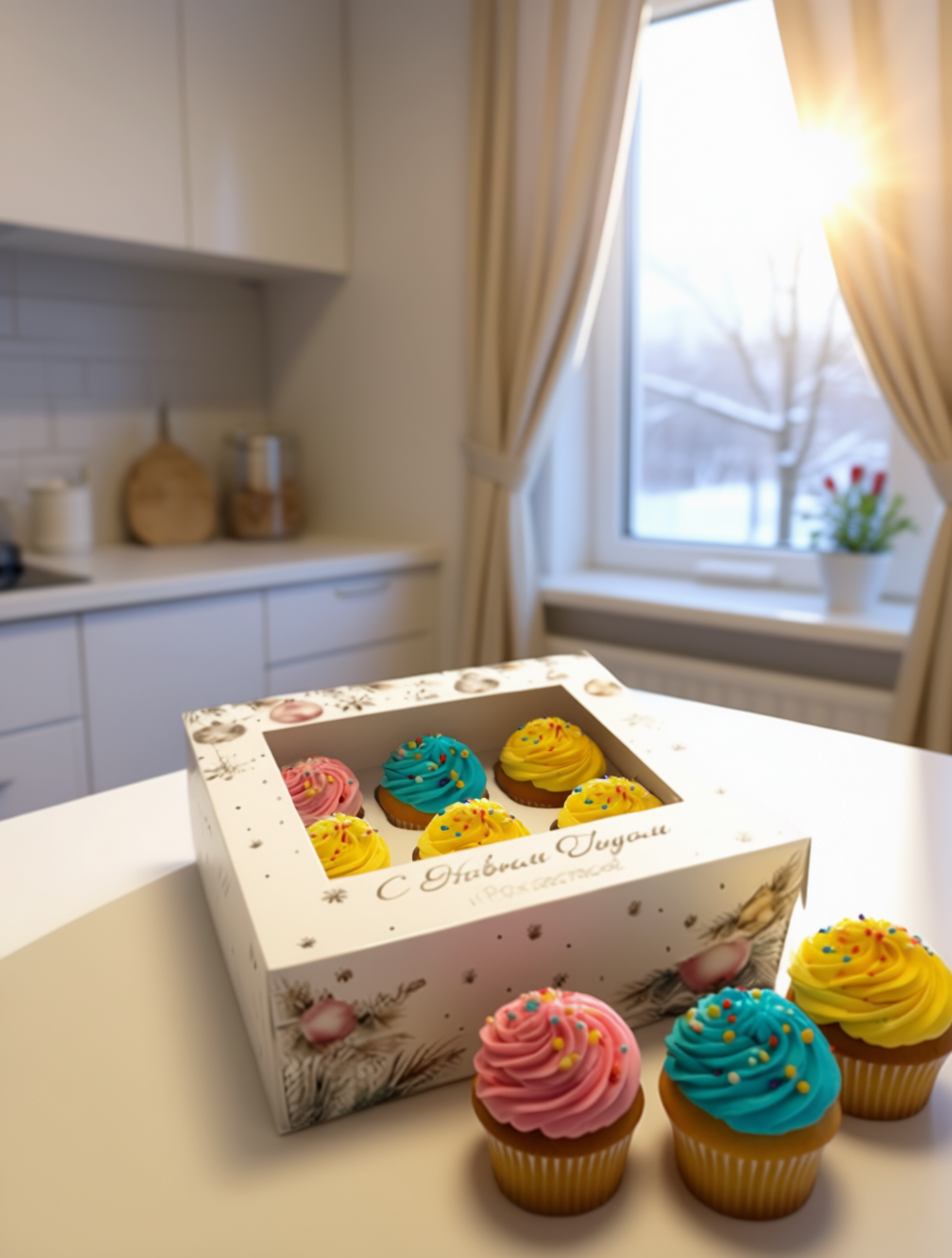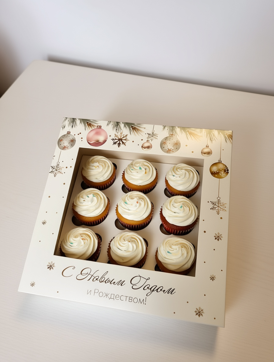 Коробка с крышкой с окном с новогодним дизайном. Подходит для размещения 9 капкейков, кексов, маффинов, пирожных и иных сладких презентов. Может быть использована для размещения изделий ручной работы, оформления подарков.