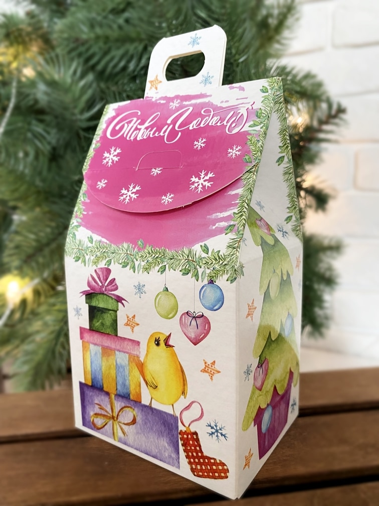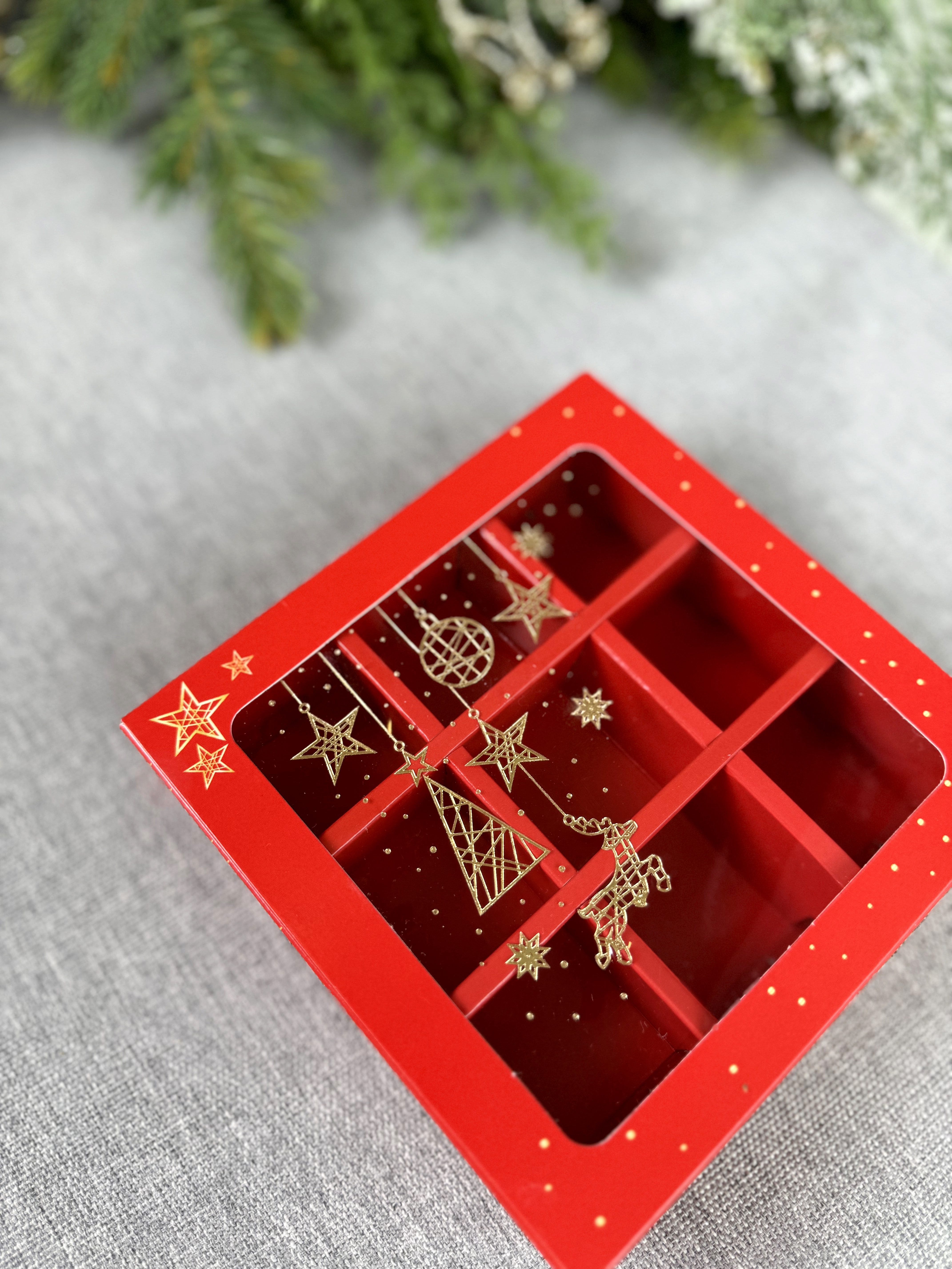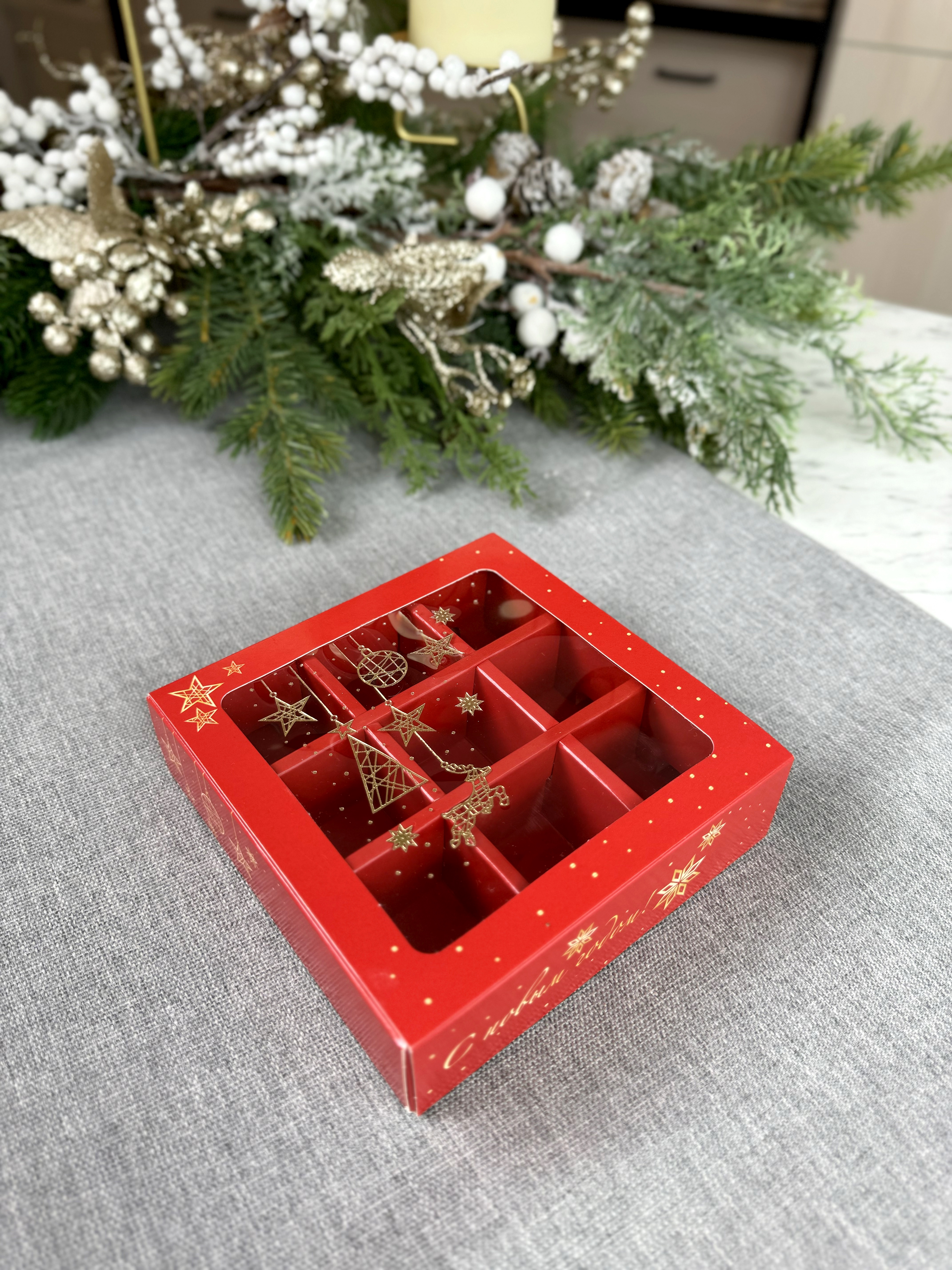 Новогодняя коробка с обечайкой - пенал на 9 конфет с внутренними разделителями для конфет с Новогодней тематикой, размер ячейки 35х35х35 мм. Без разделителей подходит для размещения пряников, печенья и иных сладких презентов. Может быть использована для размещения изделий ручной работы