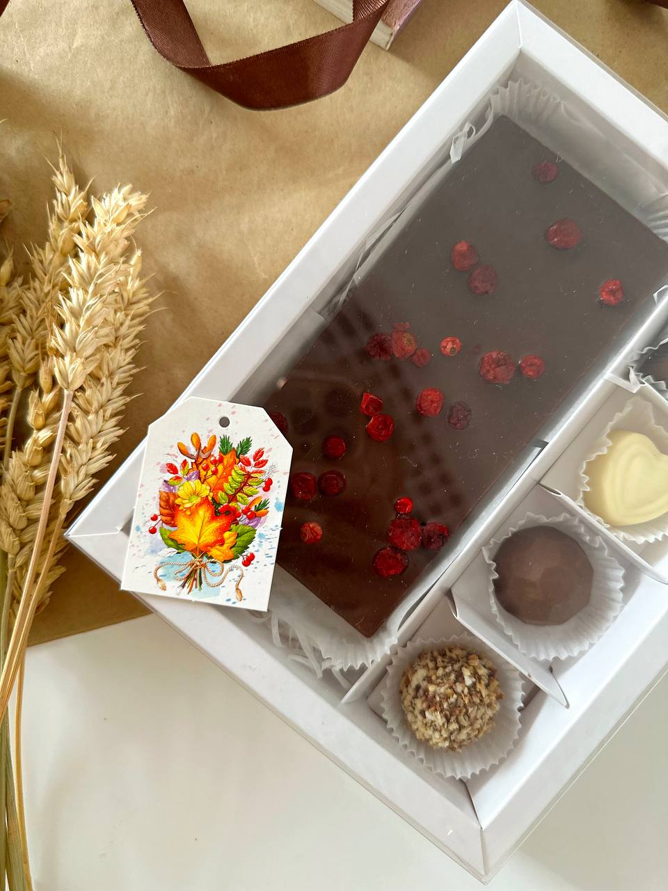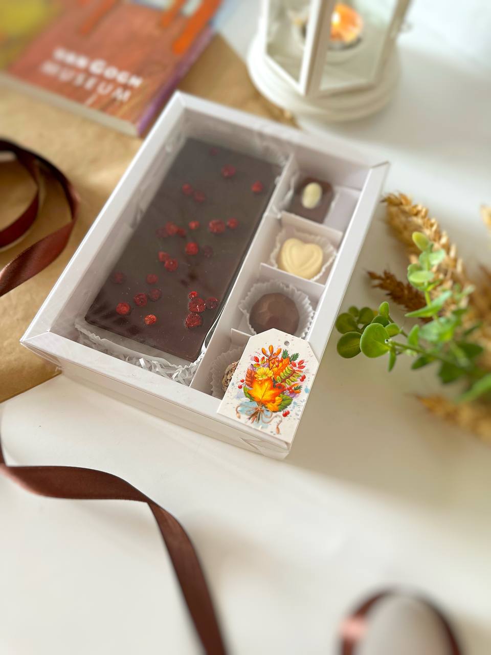 Коробка с прозрачной крышкой 4 конфеты и плитку шоколада, белый