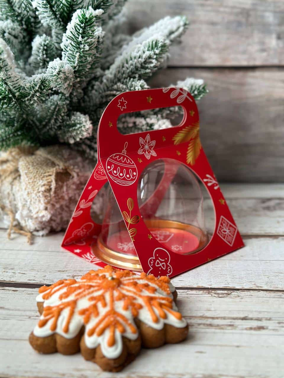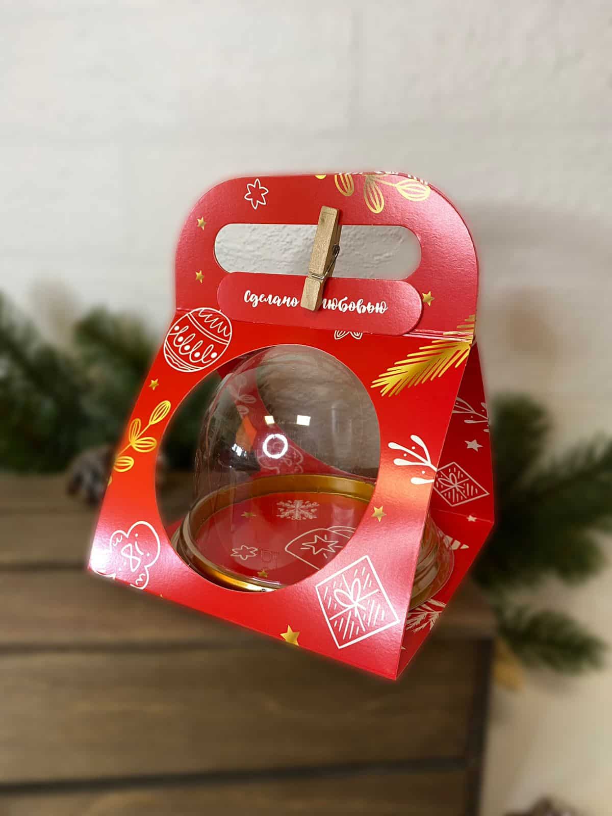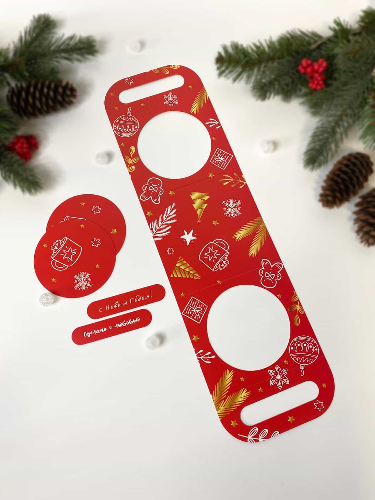 Новогодняя упаковка в виде сумочки для удержания купольной упаковки для 1 капкейка/пирожного/шоколадной фигурки. В комплект выходит сумочка, 2 круглые подложки под пирожные диаметром 8,5 см и 2 бирочки с пожеланиями.