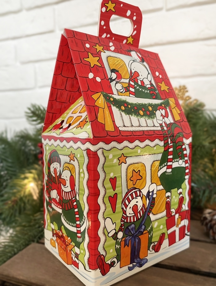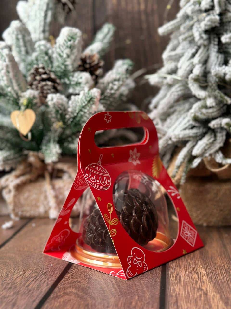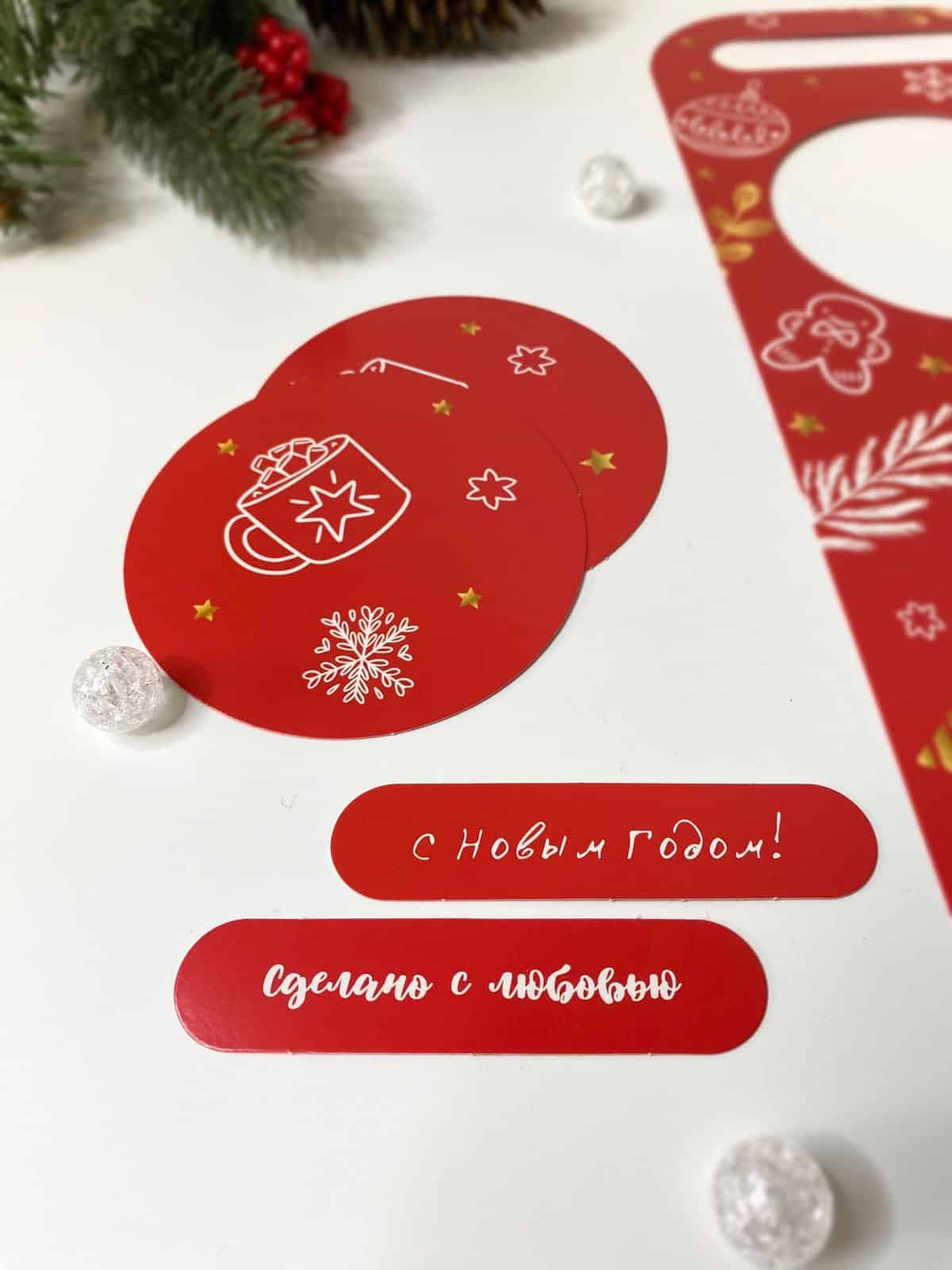 Новогодняя упаковка в виде сумочки для удержания купольной упаковки для 1 капкейка/пирожного/шоколадной фигурки. В комплект выходит сумочка, 2 круглые подложки под пирожные диаметром 8,5 см и 2 бирочки с пожеланиями.
