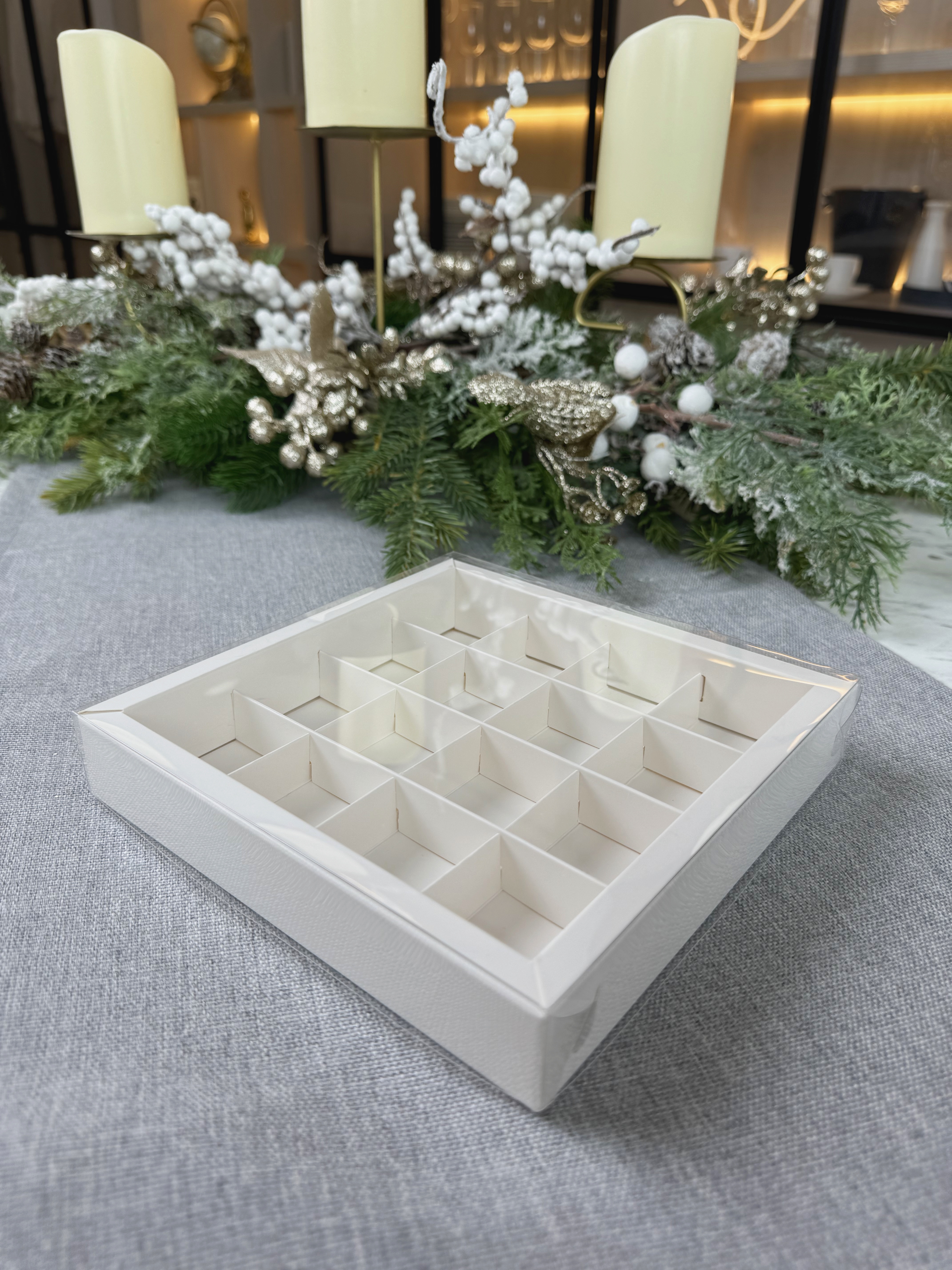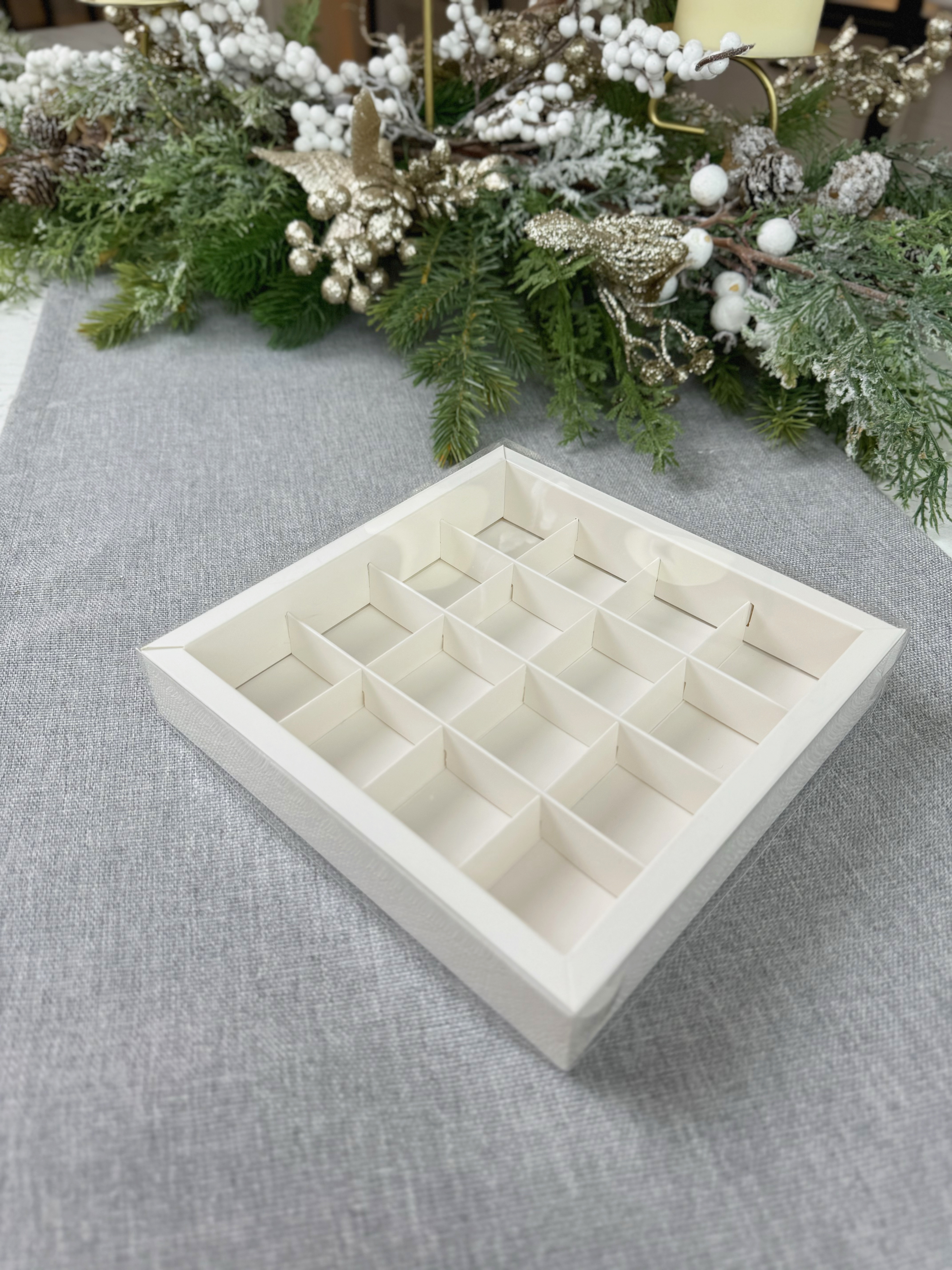 Коробочка на 16 конфет с прозрачной крышкой. Прекрасно подходит для размещения конфет ручной работы. Внешний размер 18*18*3 см, внутренний размер 16*16*3 см, размер ячейки 4*4*3 см. Продается упаковками по 5 шт, цена указана за 1 шт.