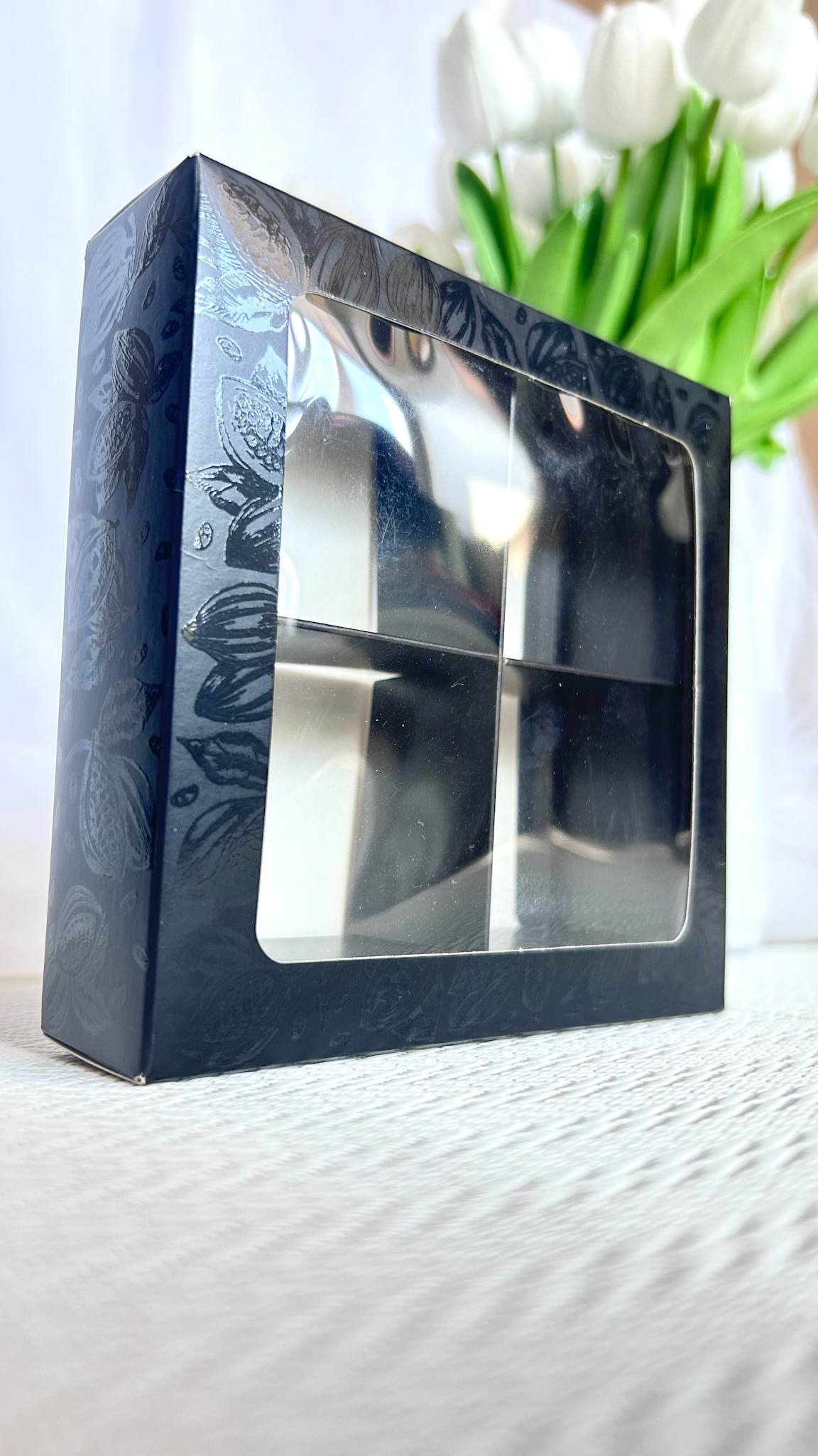Коробка на 4 конфеты с внутренними разделителями, размер ячеек 5*5*3,5 см. Подходит для размещения макарун, печенья, пряников, мармелада и иных сладких презентов. Внутренние разделители легко вынимаются из коробочки, изделие может быть использовано, как универсальное для размещения изделий ручной работы, подарков и прочих изделий.