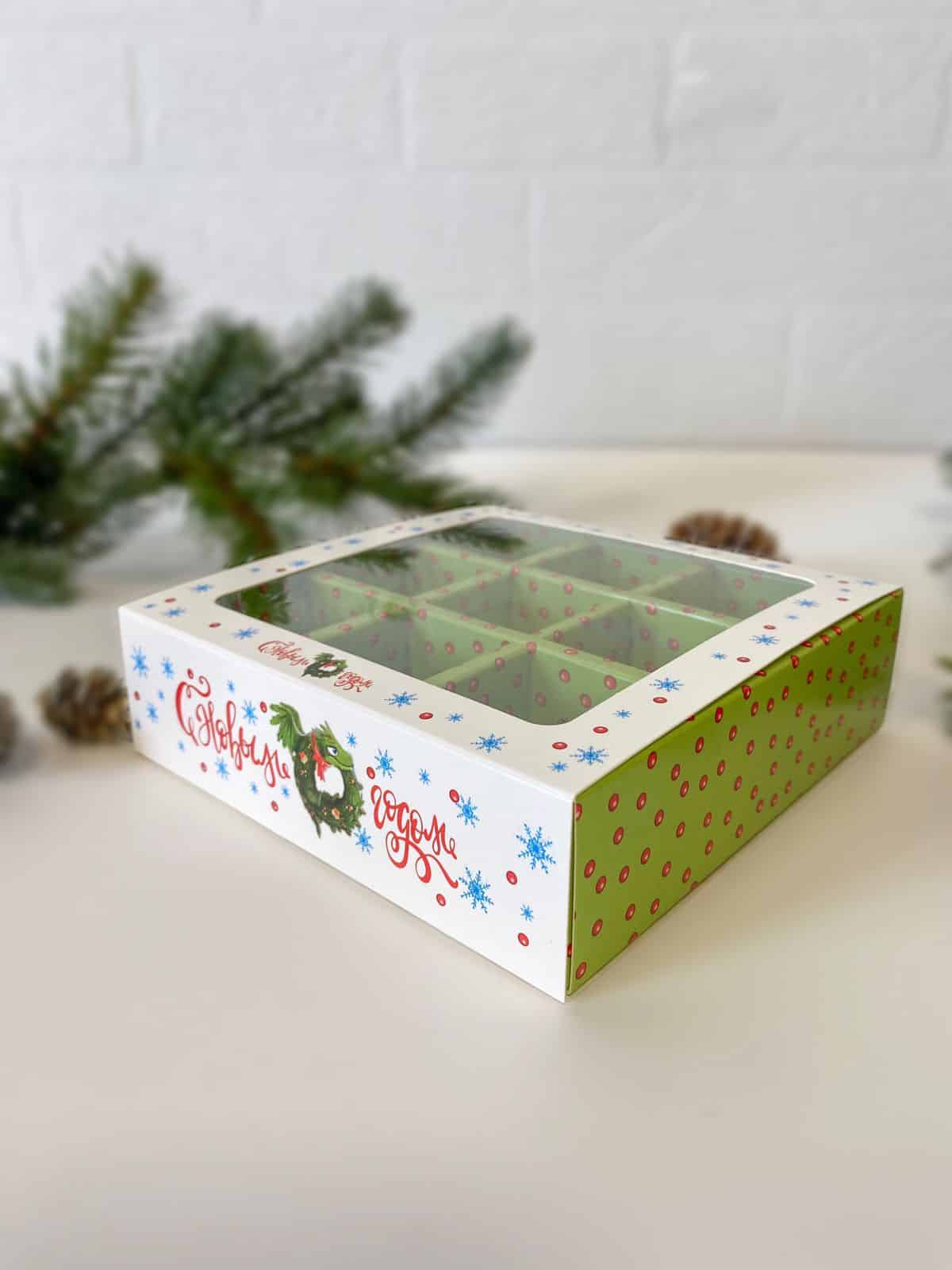 Новогодняя новинка 2023/2024. Коробка с обечайкой с символом 2024 года - драконом. Коробка предназначена для размещения 9 конфет, размер ячеек 35х35х35 мм. Без разделителей подходит для размещения различных сладостей, подарков и изделий ручной работы. Дарите с удовольствием!