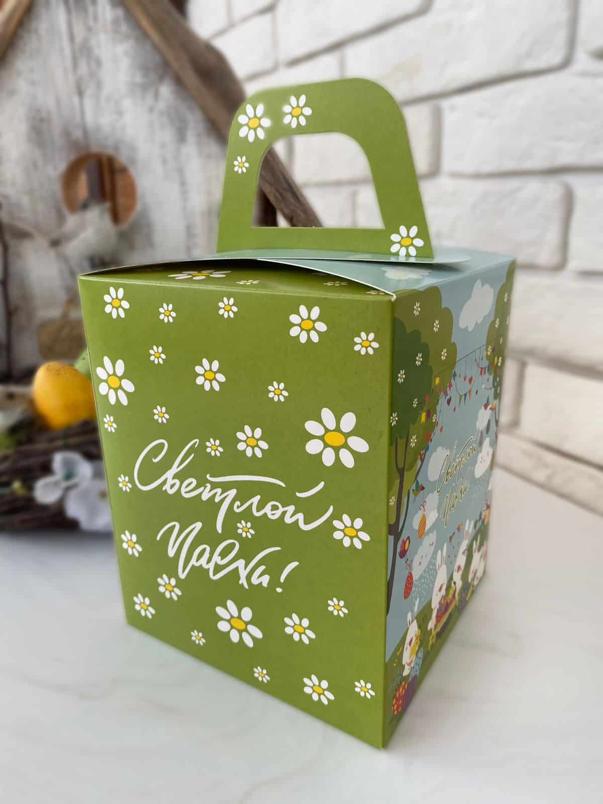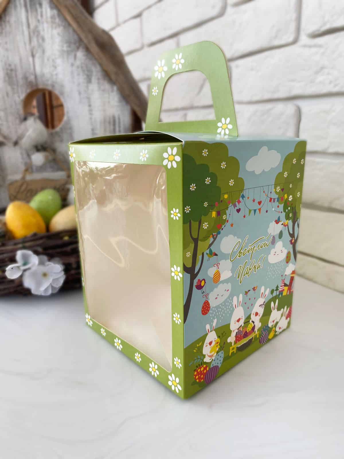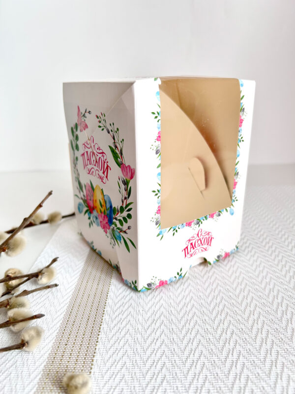 Подходит для размещения пасхального кулича, праздничного кекса. Выполнен из прочного целлюлозного картона, хорошо держит форму и предотвращает повреждение кондитерского изделия при транспортировке