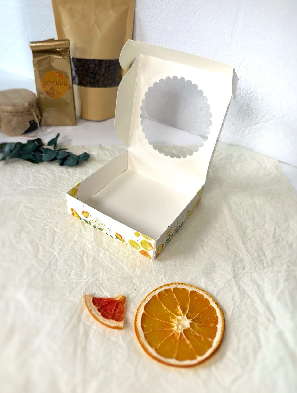 Кондитерская упаковка. Подходит для размещения пончиков, тартов, печенья, пряников, мармелада, шоколада и иных сладких презентов. Может быть использована в качестве универсальной упаковки для размещения изделий ручной работы. Размер 11,5х11,5х3 см. продается упаковками по 5 шт. (цена указана за 1 шт.)