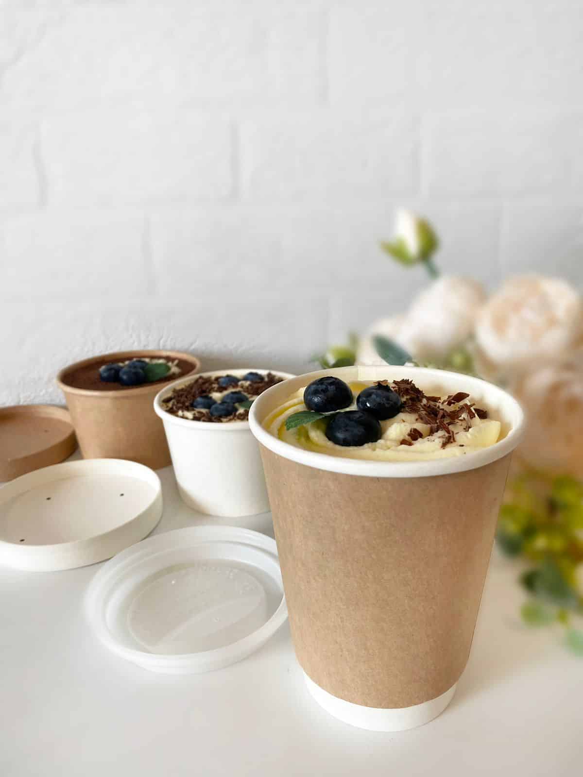 Бумажные стаканчики. Подходят для холодных и горячих напитков благодаря стенкам из плотного картона. Надежный слой внутренней ламинации предотвращает проникновение жира, влаги. Помимо напитков, такая упаковка подходит для мороженого, фруктовых салатов, сладких щербетов.